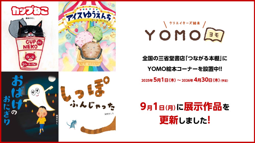 三省堂書店が展開する「つながる本棚」に、クリエイターズ絵本「YOMO」から選りすぐりの絵本や新刊絵本を設置しております。第3弾となる9月は、『カップねこ』『アイスゆうえんち』『おばけのおにぎり』『しっぽふんじゃった』の4作品をご紹介いたします。YOMO絵本大賞(絵本コンテスト)やイベント等の告知もいたしますので、お楽しみに!